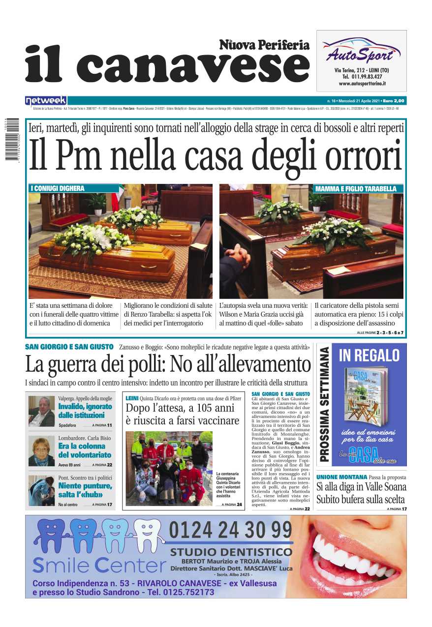 Come ogni settimana sono tantissime le notizie che troverete su Il Canavese – edizione Rivarolo. In questa edizione in primo piano la strage di Rivarolo: è stata la settimana dei funerali delle quattro vittime, sabato quello dei coniugi Dighera, martedì quello di Grazia Valovatto e Wilson Tarabella. Ancora ampio spazio alla vicenda, le indagini e gli approfondimenti. E poi il Covid e i vaccini: dopo una lunga attesa finalmente la leinicese Quinta Dicarlo, 105 anni, ha ricevuto la prima dose di vaccino. A San Giorgio e San Giusto sindaci in campo contro l’allevamento intensivo di polli. E ancora, “sì” alla diga in Valle Soana.