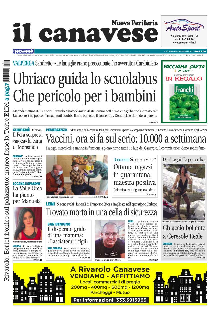 Come ogni settimana sono tantissime le notizie che troverete su Il Canavese – edizione Rivarolo. In questa edizione in primo piano l’autista dello scuolabus di Valperga denunciato per guida in stato di ebbrezza: l’allarme dato dal sindaco dopo che alcuni genitori lo avevano chiamato preoccupati. E poi ancora il Covid, con i vaccini ora si fa sul serio: 10.000 a settimana. A Bosconero 80 ragazzi della primaria in quarantena dopo la positività di una maestra: è polemica fra sindaco e dirigente scolastico. E poi ancora la morte di Francesco Sforza, 44enne di Leini implicato nell’operazione Cerbero trovato morto in una cella di sicurezza in Spagna. E ancora a San Benigno il disperato appello di una mamma che da anni lotta per avere giustizia: “Lasciatemi i miei figli”. A Ceresole il clima è “bollente”: dopo i peni disegnati sulla neve è arrivata la pornostar Sabrina Ice. A Cuorgnè si parla già di elezioni: il Pd “gioca” la carta Morgando. Lutto in Valle Orco per la scomparsa di Manuela Asinardi, sconfitta da un brutto male ad appena 44 anni.