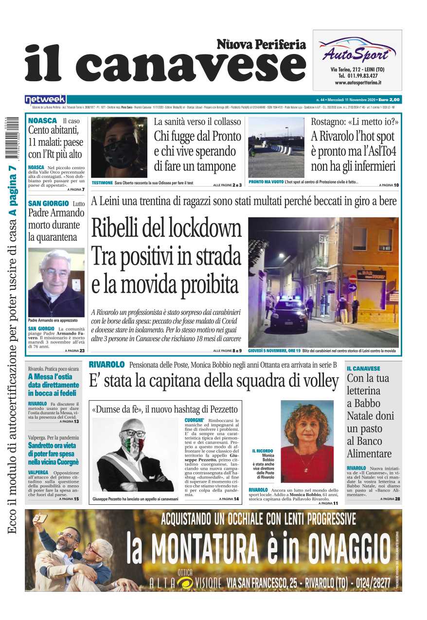 Come ogni settimana sono tantissime le notizie che troverete su Il Canavese – edizione Rivarolo. In questa edizione in primo piano l’emergenza sanitaria e la situazione al limite degli ospedali Asl To4, poi i “ribelli del lockdown”: in Canavese controlli rafforzati per il rispetto delle regole della zona rossa.  E poi l’hot spot tamponi di Rivarolo, già allestito e pronto per essere operativo… ma mancano gli infermieri, mentre Noasca conta un Rt altissimo registrando 11 positivi su 100 abitanti.  Lutto a San Giorgio per la scomparsa di don Armando a Rivarolo per la morte di Monica Bobbio, ex pallavolista e vicedirettore delle poste.  E ancora l’appello del sindaco di Cuorgnè Beppe Pezzetto ai canavesani: “Dumse da fè”.