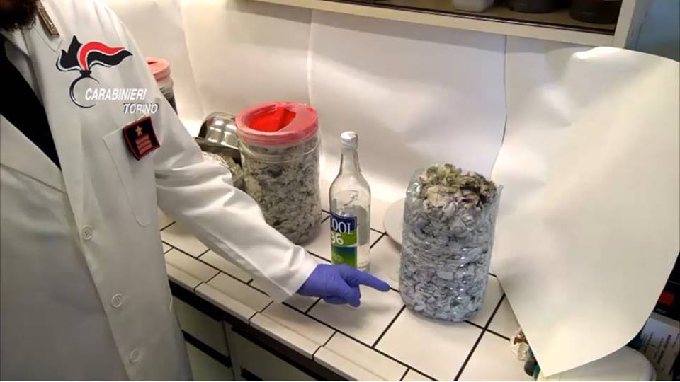 I militari, nel corso di una perquisizione di iniziativa presso un bar sito in pieno centro, a San Giusto Canavese, hanno scoperto nel locale cucina un laboratorio dotato del materiale occorrente all’estrazione di cocaina. Nello specifico sono stati rinvenuti dei recipienti contenenti complessivamente sei litri di solvente. Che dai primi accertamenti è risultato contenere sostanza stupefacente del tipo cocaina. In altri recipienti i carabinieri hanno rinvenuto centinaia di pagine di testi giuridici intrise di cocaina da ricavare attraverso processi chimici. Le pagine erano appallottolate che dai primi accertamenti sono risultate intrise di cocaina.