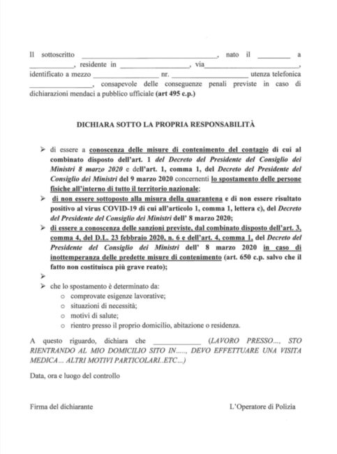 Ecco il modulo da scaricare, stampare e compilare per muoversi in questi giorni per chi avesse esigenze lavorative o sanitarie o comunque previste dal DPCM. Vi invitiamo a leggere con cura il modulo e a seguire in ogni caso le indicazioni delle fonti ufficiali.