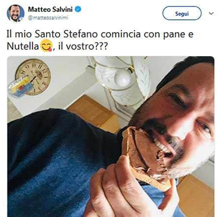 In realtà il leader della Lega appena un anno fa aveva postato sui social una foto che lo ritraeva mentre faceva colazione proprio a pane e Nutella scrivendo: “Il mio Santo Stefano comincia con pane e Nutella, il vostro???». E in più di un’occasione aveva sottolineato il suo amore per la crema spalmabile di casa Ferrero.