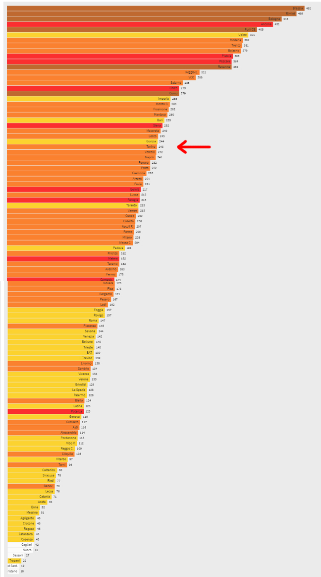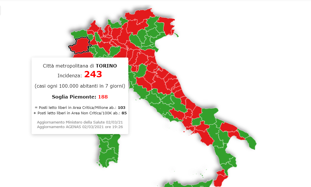 Nella Città Metropolitana di Torino la situazione è al limite, con una incidenza media provinciale, negli ultimi 7 giorni di 243 casi ogni 100mila abitanti.