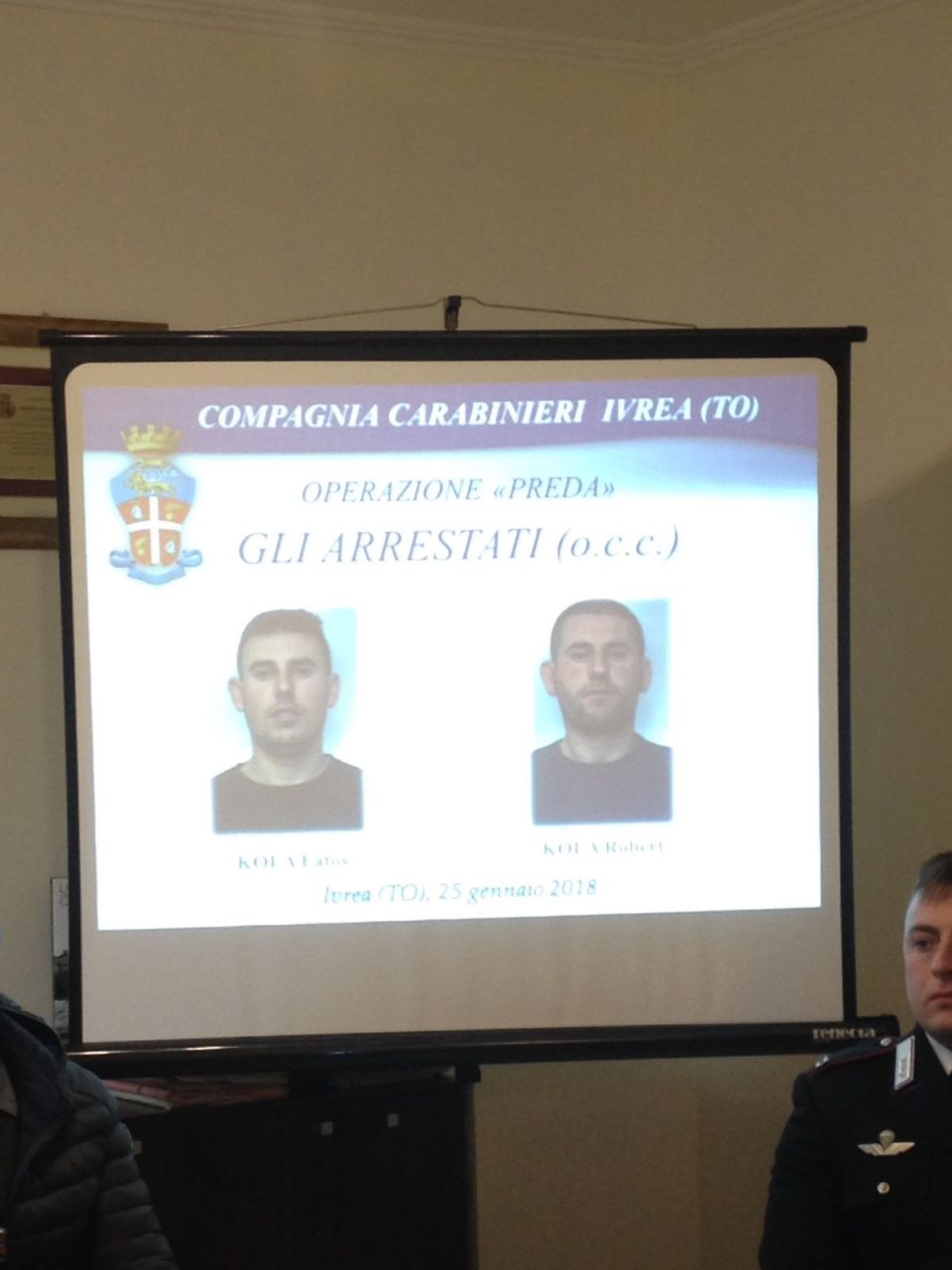 Questa mattina, giovedì 25 gennaio, i carabinieri della Compagnia di Ivrea, in collaborazione con i colleghi di Corsico (MI), del Nucleo Elicotteri Carabinieri e del Nucleo Cinofili di Volpiano TO, hanno eseguito un’ordinanza di applicazione di misure cautelari emessa dal GIP del Tribunale di Ivrea, su richiesta della locale Procura della Repubblica, nei confronti di Arvit Sada, 34 anni, albanese, residente in Cuorgnè (TO), Giuliana Lomuscio, 25 anni, italiana, residente in Quincinetto (TO) e i fratelli Robert Kola, 32 anni, albanese, residente in Prascorsano (TO) e Fatos Kola, 26 anni, albanese, dimorante in San Giorgio Canavese(TO), un quinto indagato è attualmente ricercato.