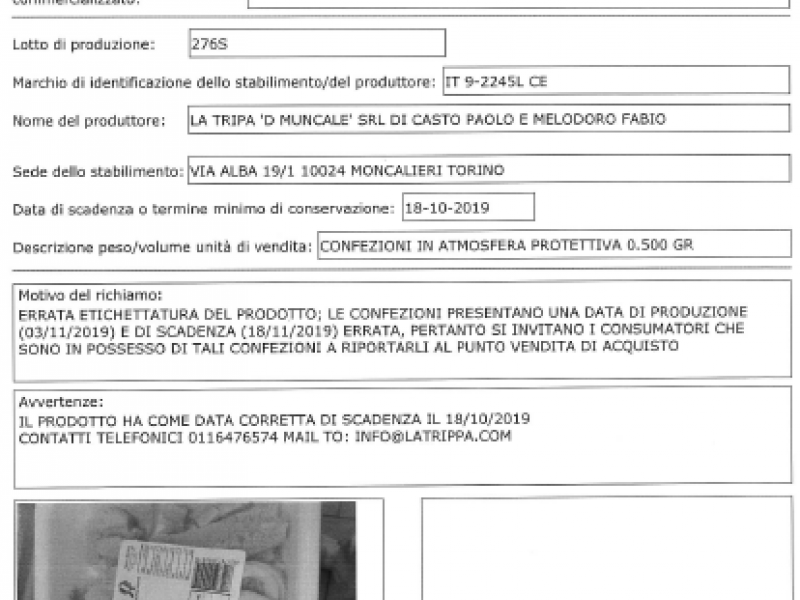 Trippa precotta prodotta a Moncalieri ritirata dal Ministero della Salute a causa di un errore sulla data di scadenza stampata in etichetta.