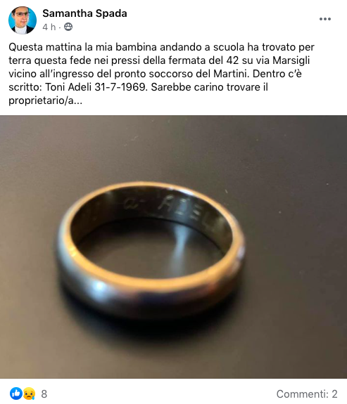 Lo guarda meglio e vede che all’interno c’è un nome e una data: Toni Adeli 31-7-1969. L’oggetto è sicuramente prezioso per chi lo ha perso chissà quando su quella strada, via Marsigli, che tra l’altro è vicinissima anche al pronto soccorso Martini. Non resta che dirlo ai genitori: loro sapranno cosa fare. E infatti i genitori si mobilitano, la mamma posta sul gruppo di quartiere l’immagine dell’anello ritrovato e inizia il tam tam sui social, tutti vogliono dare una mano a fare in modo che l’anello torni al dito di chi lo ha portato per più di 50 anni.