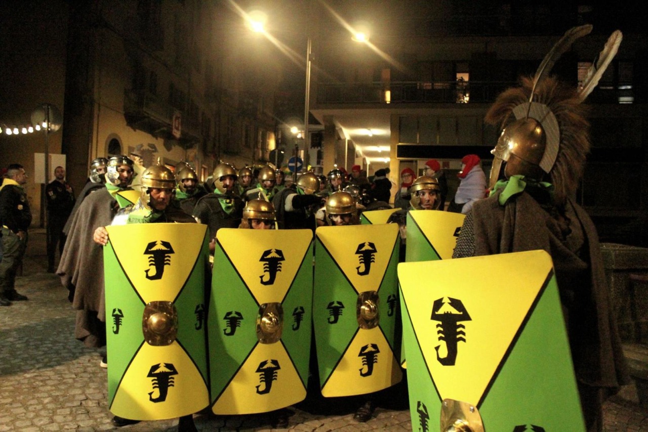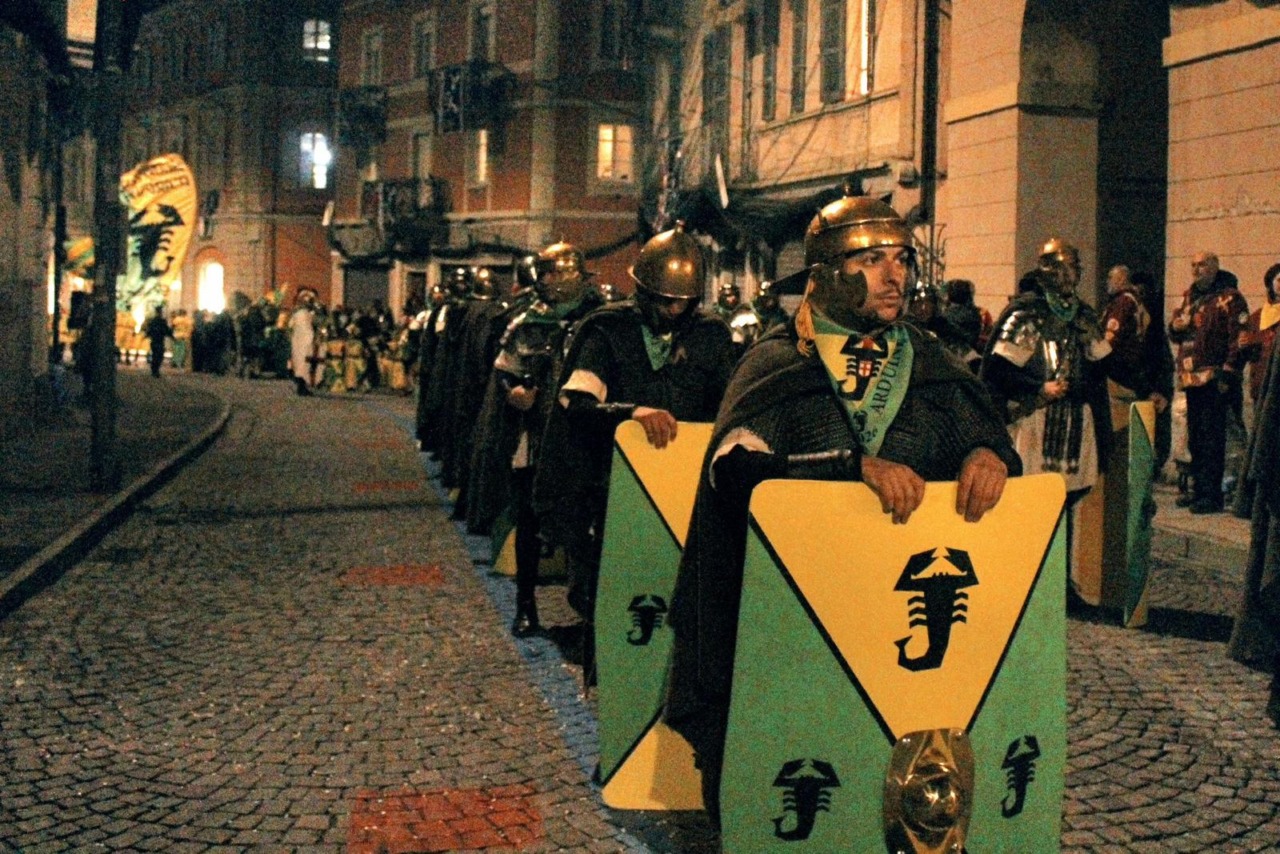 Alla parata il Pontifex Scorpionis, attorniato dalle graziose Vestali Arduine (sei proprio come nell’antica Roma) portatrici dei sacri valori giallo verdi e custodi delle genialità arduine. I Legionari hanno ricevuto gli ordini in latino, indossando panoplie (armature) filologicamente accurate e elmi ricostruiti in base a rinvenimenti archeologici. Le manovre nel corso della marcia sono state il frutto di diversi addestramenti. Tutti gli scudi sono stati realizzati e dipinti a mano per l’occasione. Gli uomini del popolo indosseranno il tipico abbigliamento riservato all’ordine degli Equites, la tunica con le due strisce verticali con l’intento di omaggiare la plausibile origine del nome Eporedia (Epo da Epona, divinità equestre romana di origine celtica, e redia da Raeda tipico carro per il trasporto delle persone), ancestrale legame tra i cavalli ed il territorio eporediese. Ad impreziosire ulteriormente la sfilata anche un Agrimensore, una sorta di geometra dell’epoca, intento a destreggiarsi con la Groma arduina, inserito quasi d’obbligo in quanto fino alla scoperta di un esemplare di groma a Pompei, la prima e unica rappresentazione al mondo di tale strumento avvenne proprio ad Ivrea, scolpita sulla stele funeraria dell’agrimensore Lucius Aebutius Faustus, e custodita tutt’ora al Museo Garda, proprio nella piazza di tiro degli Scorpioni d’Arduino.