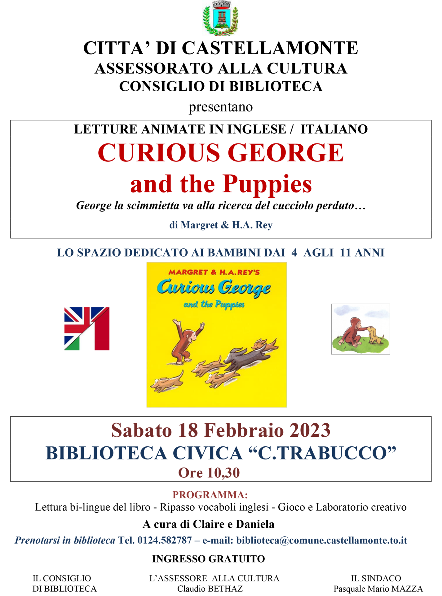 Lettura animata in inglese-italiano rivolta ai bambini dai 4 agli 11 anni del libro “CURIOUS GEORGE AND THE PUPPIES” – di Margret & H.A.Rey – George la scimmietta va alla ricerca del cucciolo perduto… Lettura bilingue della storia, ripasso dei vocaboli inglesi. A seguire è verrà organizzata una piccola caccia la tesoro in inglese e laboratorio creativo (ogni bambino/a produrrà una maschera di Carnevale che potrà poi portare a casa).