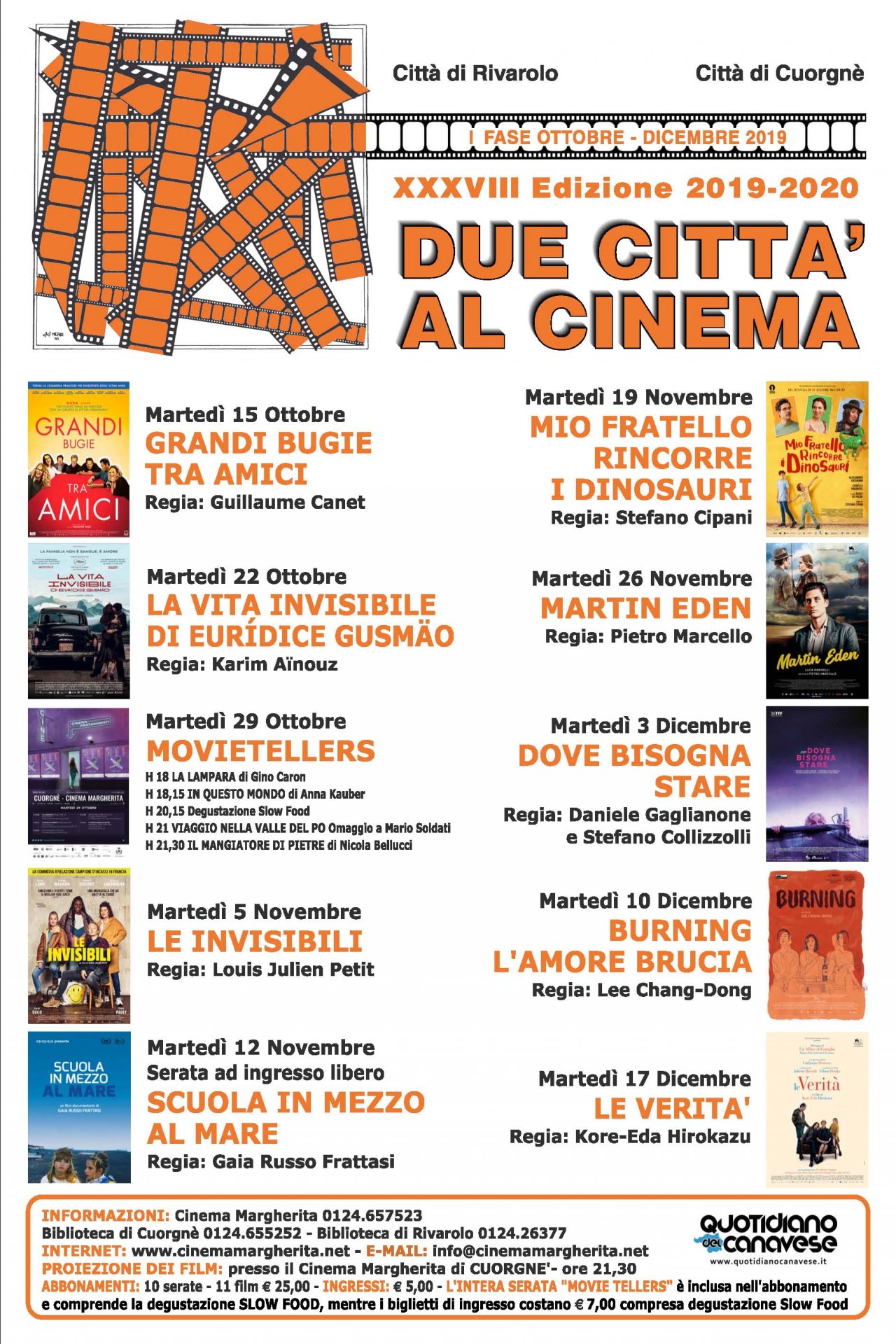 “L’edizione 38, che vede ancora la collaborazione dei comuni di Cuorgnè e Rivarolo, è un contenitore in cui confluiscono varie proposte – spiegano gli organizzatori di Due Città al Cinema – Si inizia con due film usciti in settembre che hanno unito negli apprezzamenti critica e pubblico. In particolare La vita invisibile di Euridice Gusmao è la prima delle due escursioni extraeuropee, in Brasile. Il 29 ottobre si terrà Movietellers, serata inclusa nell’abbonamento con l’intermezzo enogastronomico curato dal presidio Slowfood. Per presentare uno dei fiori all’occhiello di Film Commission Piemonte sarà presente Nicola Bellucci, il regista del film I Mangiatore di pietre che chiude la serata. Il 5 novembre il film francese “Le invisibili” grande successo in Francia ed apprezzato in Italia per l’approccio alla tematica trattata”.