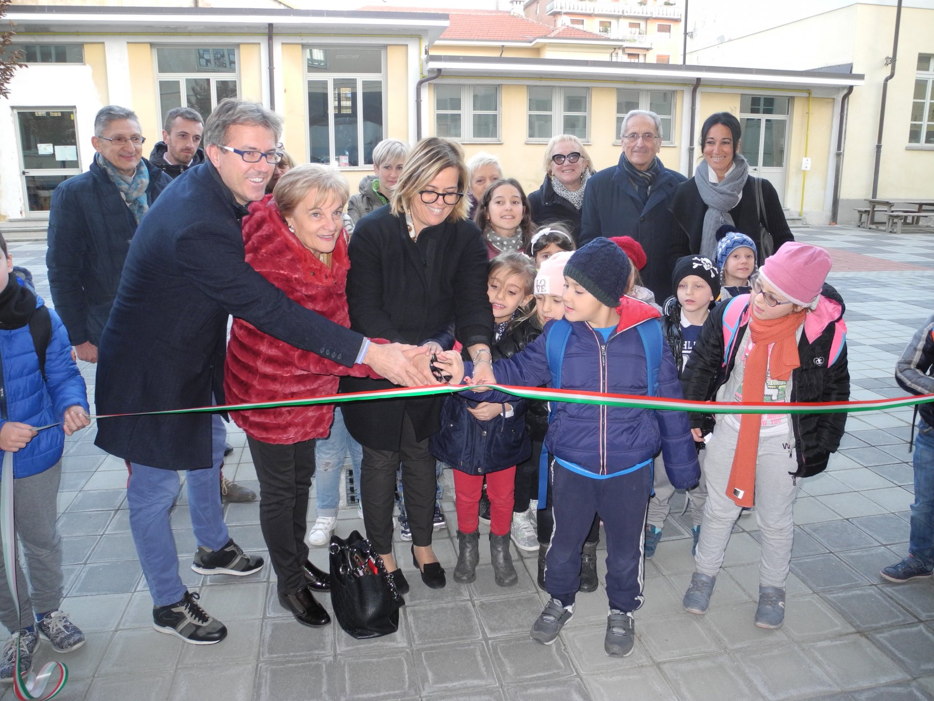 Tutti insieme per il taglio del nastro del nuovo cortile alla Primaria Fenoglio. “E’ sempre bello poter tagliare un astro di inaugurazione” ha esordito il sindaco Loredana Devietti. Insieme a lei, anche gli assessori Andrea Sala e Fabrizio Fossati, e il consigliere Domenica Calza. Adesso la richiesta dei genitori è quella di sistemare i servizi igienici della scuola. “E’ nei programmi” ha risposto il primo cittadino.