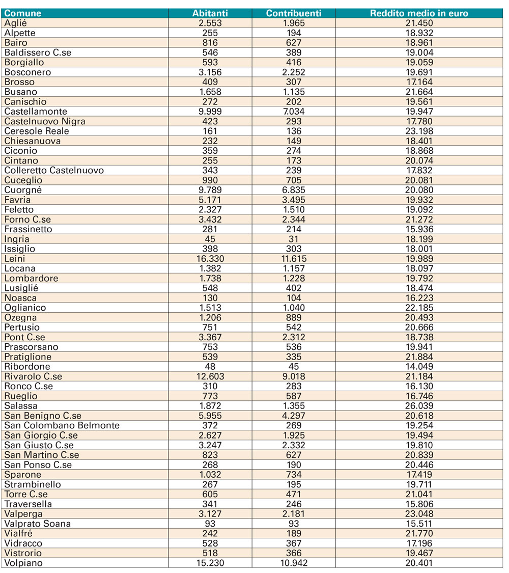 Sul podio anche Ceresole Reale con 23.198 euro e Valperga con 23.048 euro. Seguono Oglianico (22.185), Pratiglione (21.884), Vialfrè (21.770), Busano (21.664), Agliè (21.450), Forno C.se (21.272), Rivarolo C.se (21.184) e, poco distante, Torre C.se (21.041). Il comune con il reddito più basso della zona è Ribordone con 14.049 euro. Sotto i 15 mila anche Traversella e Valprato Soana. Proprio in questo comune, però, si può notare un dato curioso e che fa onore: risultano 93 abitanti e 93 contribuenti.