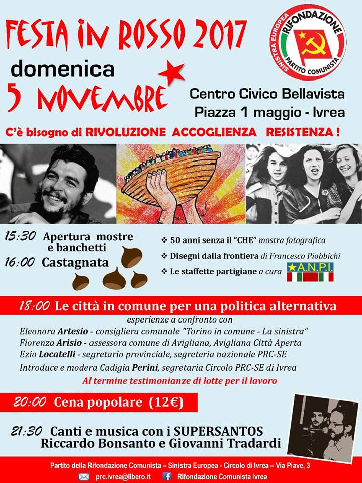 Con Rifondazione Comunista torna in piazza domenica, 5 novembre, la Festa in rosso. L’appuntamento è dal pomeriggio al centro civico di Bellavista a Ivrea. Quest’anno lo slogan è “C’è bisogno di rivoluzione, accoglienza, resistenza”. Molti sono gli ospiti attesi all’evento.