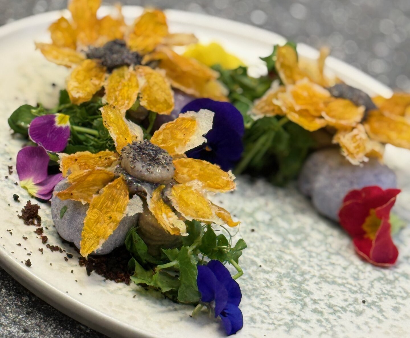 Ingredienti: 3 teste di un girasole piccole; 300 ml olio di semi di girasole; 100 gr semi di girasole; 1 limone; 30 ml olio evo; 100 gr olive taggiasche; 40 gr fiori edibili; 100 gr patate viola; 20 gr burro; 80 gr burro chiarificato; 30 gr semi di sesamo; sale, salvia e rosmarino qb.