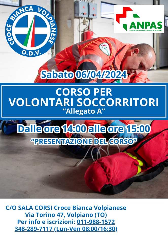 La Croce Bianca Volpianese, associazione di volontariato aderente all’Anpas, invita sabato 6 aprile 2024 alle 14 a partecipare alla presentazione del nuovo corso gratuito per diventare volontari soccorritori e volontarie soccorritrici del servizio di emergenza sanitaria 118. L’incontro si terrà presso la sede della Croce Bianca in via Torino, 47 a Volpiano.