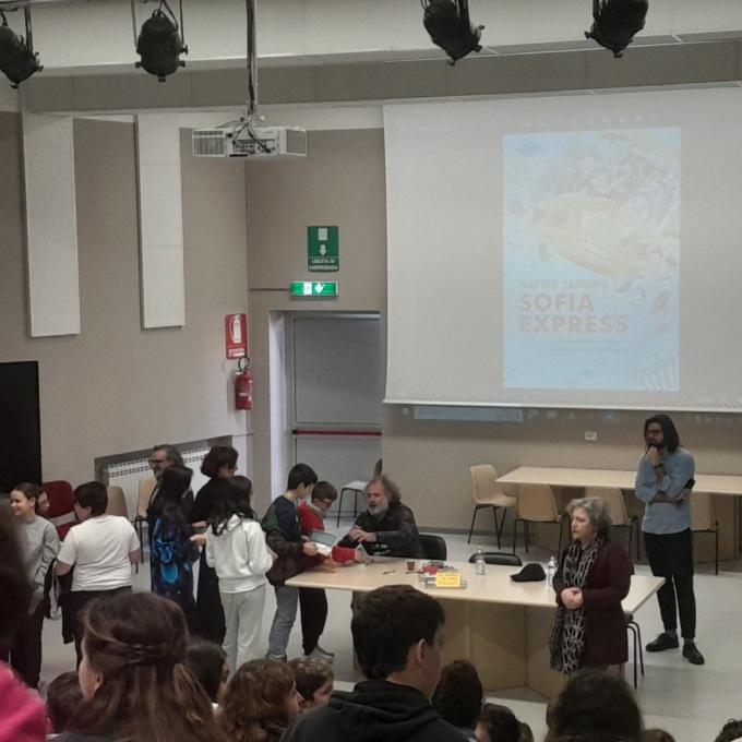 Martedì 12 marzo 2024, le alunne e gli alunni delle classi prime e seconde della secondaria di primo grado hanno avuto la possibilità di dialogare con Matteo Saudino, professore di filosofia nei licei torinese, divulgatore, blogger e scrittore di volumi dedicati alla filosofia per ragazzi e bambini. L’incontro è avvenuto come esito di un percorso di lettura sul libro Sofia express (Salani, 2023) che ha impegnato e incuriosito tutti le alunne e gli alunni durante gli scorsi mesi.