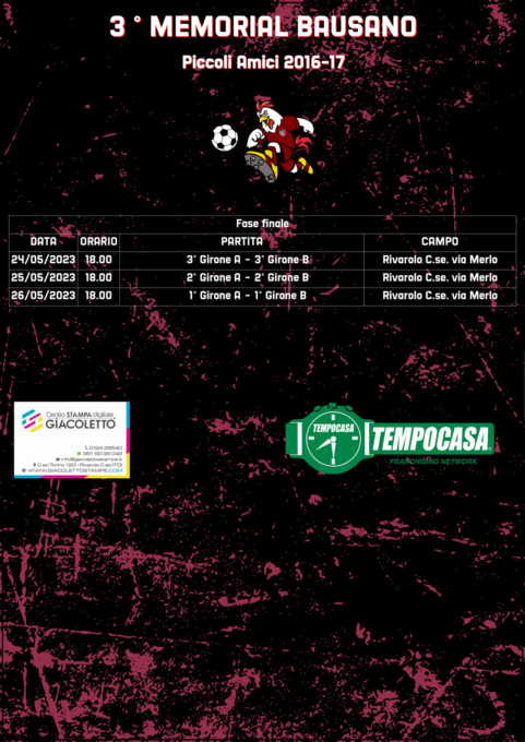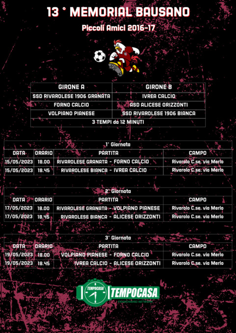Questa sera, venerdì 26 maggio, dalle 17.30 presso il campo sportivo di via Antonio Merlo a Rivarolo Canavese si svolgeranno le finali del torneo di calcio 13° Memorial Bausano organizzato da SSD Rivarolese 1906.