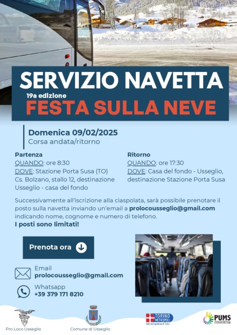 Domenica 9 febbraio torna ad Usseglio la Festa sulla Neve con le Racchette, giunta alla sua diciannovesima edizione. È un’occasione imperdibile per immergersi nella bellezza naturale della montagna e vivere una giornata all’insegna del divertimento, del benessere e della convivialità. Nella giornata festiva sarà possibile raggiungere Usseglio con il bus navetta gratuito messo a disposizione dalla Città metropolitana di Torino, in partenza alle 8,30 allo stallo 12 davanti alla stazione di Porta Susa, con arrivo alla Casa del Fondo di Usseglio. Il bus navetta gratuito è stato istituito nell’ambito delle iniziative del PUMS, il Piano Urbano per la Mobilità Sostenibile della Città metropolitana di Torino. La partenza per il rientro a Porta Susa è fissata per le 17,30 alla Casa del Fondo. Dopo essersi iscritti alla camminata con le racchette da neve, è possibile prenotare il posto sulla navetta, inviando un’e-mail all’indirizzo prolocousseglio@gmail.com, indicando il proprio nome e cognome e un numero di telefono.