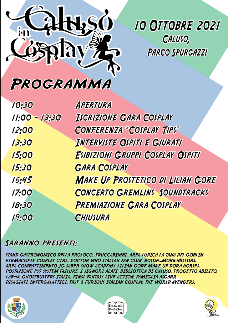 Domenica 10 ottobre Caluso ospita la 4^ Edizione del Caluso in Cosplay! Per accedere all’evento non vige l’obbligo di indossare la mascherina, ma bisognerà essere muniti di Green Pass, inoltre sarà possibile, dalle h.9 alle h.12, effettuare gratuitamente un tampone rapido in via Roma 22, davanti all’ASL, per accedere all’evento.