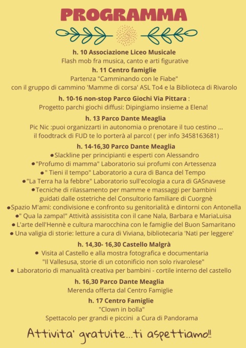 Il parco si animerà dalle 14 con molte attività: dagli esercizi di equilibrio sulla slackline per principianti ed esperti al laboratorio sui profumi con ArtEssenza. Le ostetriche del consultorio familiare di Cuorgnè proporranno tecniche di rilassamento per mamme e massaggi per bambini. Lo spazio “M’ami” accoglierà momenti di condivisione e confronto sulla genitorialità. L’associazione Buon Samaritano inviterà a scoprire l’arte dell’henné e la cultura marocchina e non mancheranno letture tratte dalla “valigia di storie” di Viviana, bibliotecaria del progetto “Nati Per Leggere”. Nel laboratorio “Qua la zampa”, attività assistite con il cane Nala, mentre Banca del Tempo e il gruppo di acquisto GASnavese cureranno laboratori sulla solidarietà e l’ecologia. Saranno presenti con campagna informativa e giochi per bambini i volontari del comitato rivarolese della Croce Rossa.