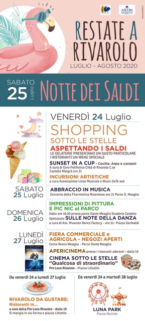 In occasione della Patronale di San Giacomo Rivarolo ritrova gli appuntamenti con Restate a Rivarolo, le iniziative organizzate in collaborazione da Amministrazione Comunale, Associazione Commercianti e la Pro loco.